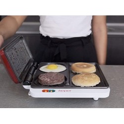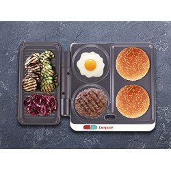 Piastra multifunzione realizzata in materiale antiaderente con 4 superfici di cottura: Piastra liscia per cuocere carne, pesce, verdure, o per riscaldare il pane, vano rigato per hamburger, vano liscio per uova e piastra rigata estendibile all’apertura a 180 gradi della piastra superiore. Una macchina unica per preparare una cena completa. Dotata di foro scola-grasso e vassoio raccogli-grasso rimovibile. Luce di funzionamento e di raggiungimento della temperatura. Con stabili piedini antiscivolo e avvolgicavo.