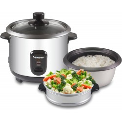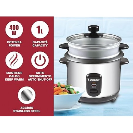 BEPER 90.550. Cuociriso e Vaporiera 2 in 1 in Acciaio, Misurino e Cucchiaio inclusi, Argento/Nero