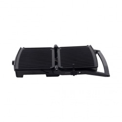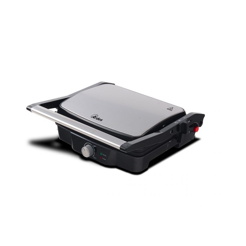 Bistecchiera 4 fette con elegante finitura in acciaio inox. Maxi piastre rigate antiaderenti 30 x 24 cm. Piastra superiore basculante, adattabile ai diversi spessori dei cibi. Possibilità di apertura a 180° per cottura barbecue. Temperatura regolabile. Lampada spia di accensione e di raggiungimento della temperatura impostata. Maniglia antiscottatura. Riponibile verticalmente. Avvolgicavo. Bicchierino raccogli grassi. Spatola sagomata per la pulizia. Potenza: 2000W.