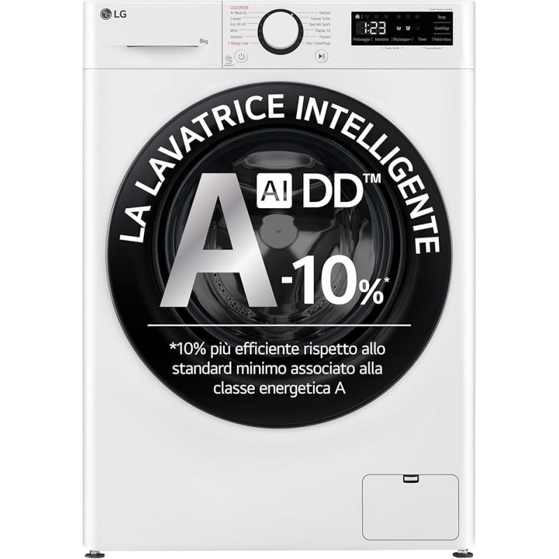 LG AI DD F2R3S08NSWB Lavatrice Slim a Carica Frontale 8kg Serie R3, Lavatrice Classe A, 1200 giri, Lavaggio Vapore, AI Wash, Motore Inverter Direct Drive, Smart Diagnosis, Libera installazione, Bianca [Classe di efficienza energetica A]