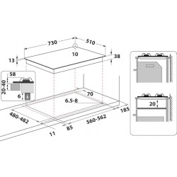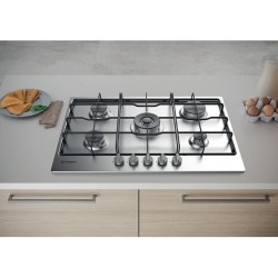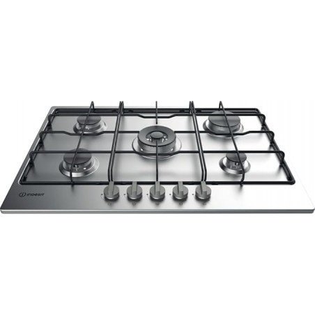 Indesit THP 752 W/IX/I Piano cottura a gas da 75 cm; 5 fuochi a gas di cui 1 High Power Flame; Accensione elettronica sottomanopola; Valvola di sicurezza gas; 3 griglie smaltate.